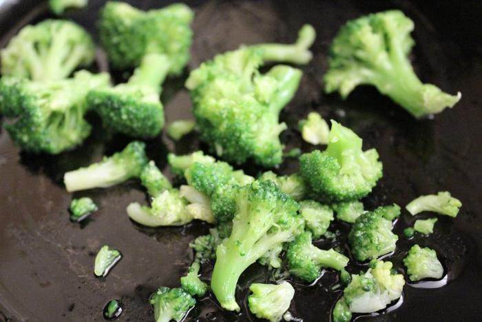 Убрать лук из сковороды и добавить свежие соцветия брокколи и минут 5-7 их тушить. Если капуста мороженная, достаточно её просто разморозить и не обжаривать.