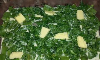 Заливаем фасоль смесью, равномерно распределяя. Выкладываем сверху несколько маленьких кусочков сливочного масла.