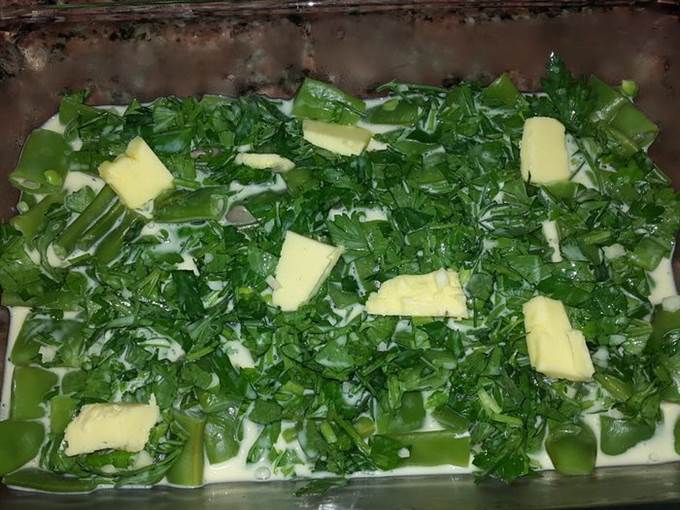 Заливаем фасоль смесью, равномерно распределяя. Выкладываем сверху несколько маленьких кусочков сливочного масла.