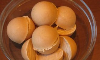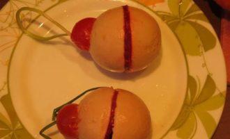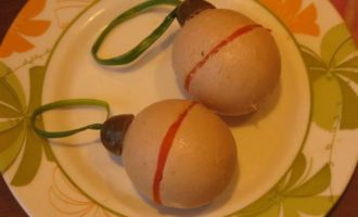 • Собираем попарно по две полусферы с прослойкой из моркови, верхушкой из оливки, ниткой лука, соединяем все шпажкой.