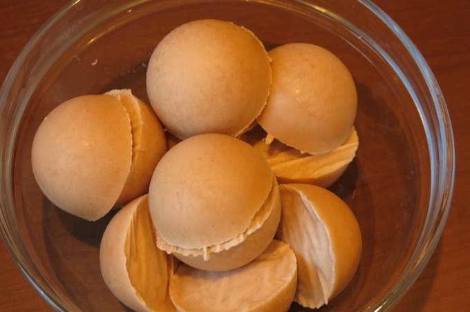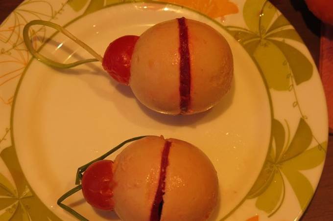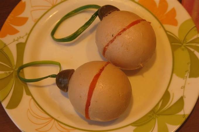 • Собираем попарно по две полусферы с прослойкой из моркови, верхушкой из оливки, ниткой лука, соединяем все шпажкой.