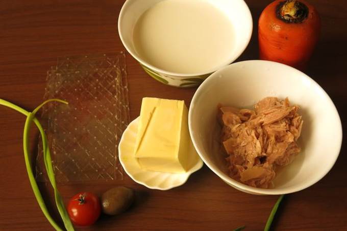 • Подготовим консервированный тунец, марка Магуро, масло сливочное (у меня соленое, больше соль не добавляла), сливки 15%, морковь и свеклу, оливки, помидоры черри, зеленый лук.