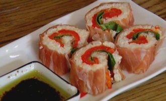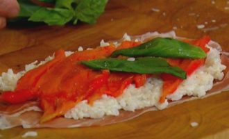 На рабочую поверхность выложить ветчину, на каждый кусочек поместить немного рисовой начинки, сверху выложить полоски сладкого перца и листья базилика.