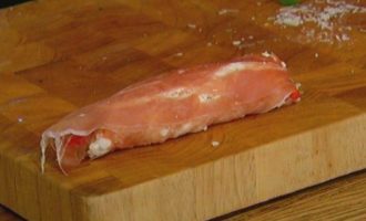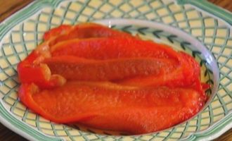 Сладкий перец запечь в духовке, затем снять кожицу и нарезать мякоть длинными, широкими полосками.