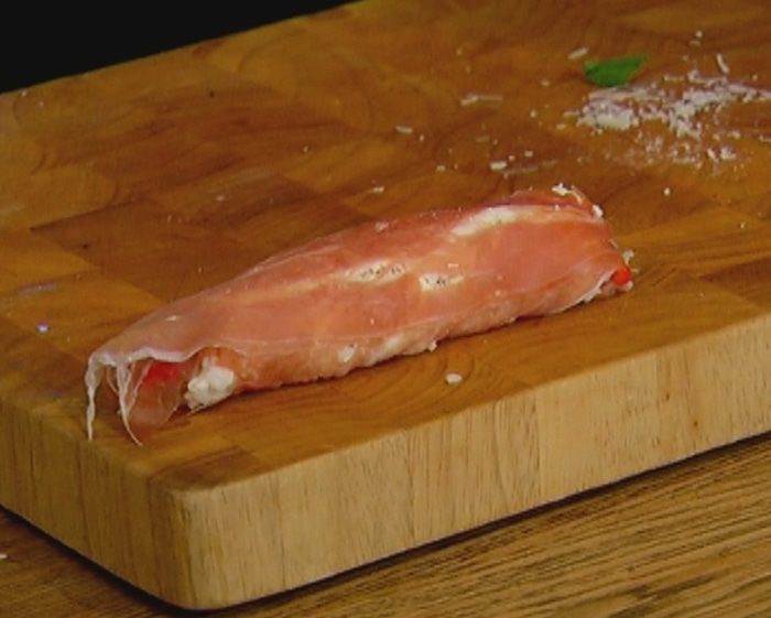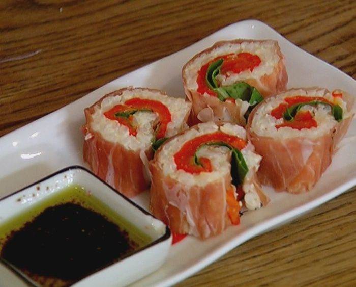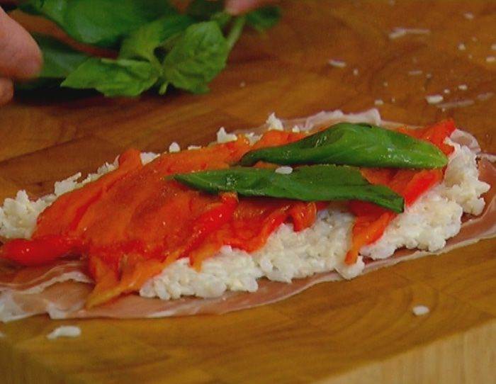 На рабочую поверхность выложить ветчину, на каждый кусочек поместить немного рисовой начинки, сверху выложить полоски сладкого перца и листья базилика.
