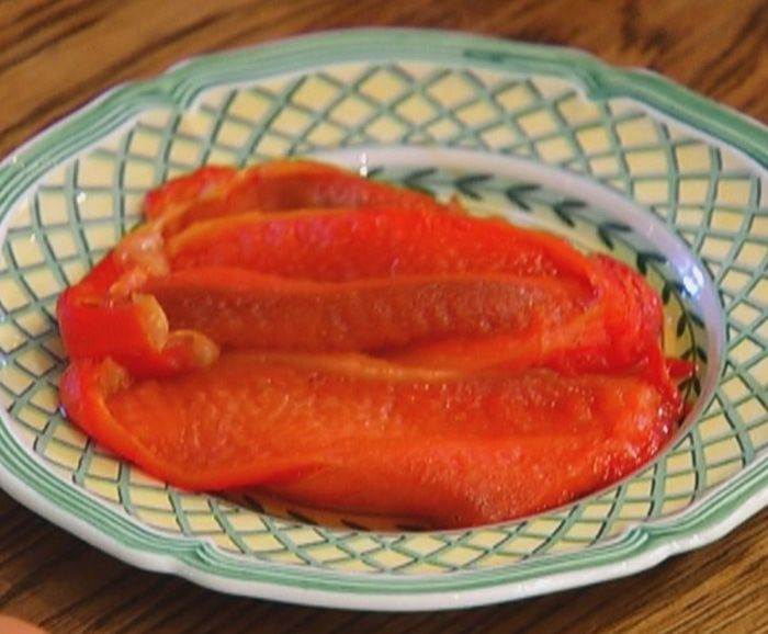 Сладкий перец запечь в духовке, затем снять кожицу и нарезать мякоть длинными, широкими полосками.