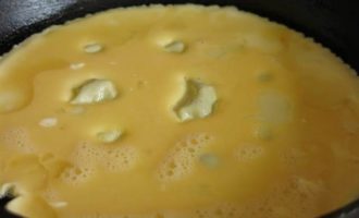 На раскаленную сковороду с растительным маслом наливаем третью часть омлетной массы.