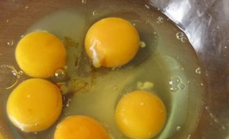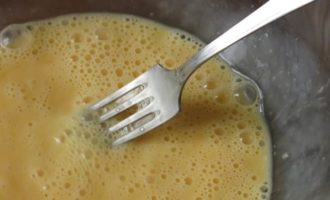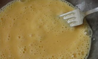 Пока варится рис, готовим омлет, добавляем к яйцам чайную ложку сахара, столовую ложку соевого соуса.
