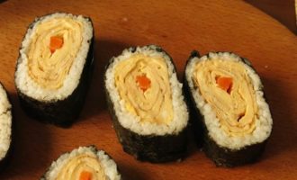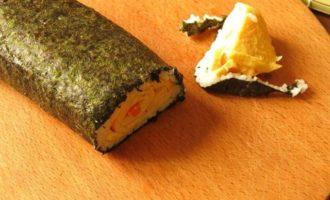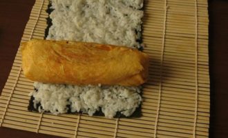 Выкладываем рис на нори так, чтобы обхватить по кругу рулет из омлета.