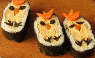 Из нори вырезаем глазки, лапки, из моркови гребень. Подаем с соусом, смесь майонеза и соевого соуса.