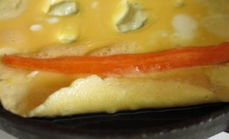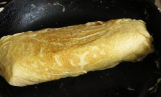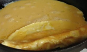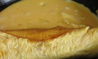 Отодвигаем омлет на край сковороды, наливаем на свободный край омлета яйца, даем схватится и снова заворачиваем. Повторяем.