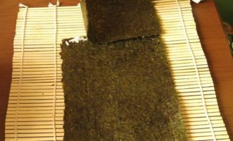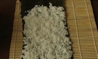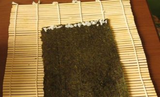 3/4 листа нори кладем на коврик (размер листа зависит от длины яичного рулета). По краю листа выкладываем тонкой полоской рис.