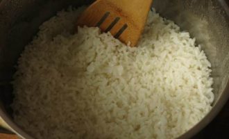 Снимаем рис с огня и выдерживаем 15 минут под крышкой. Готовим заправку, в уксусе рисовом чуть подогретом, растворяем сахар и соль, по 1 ч. л.