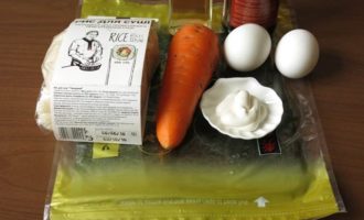 Приготовим яйца, майонез, уксус рисовый, соус соевый, сахар, морковь.