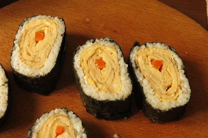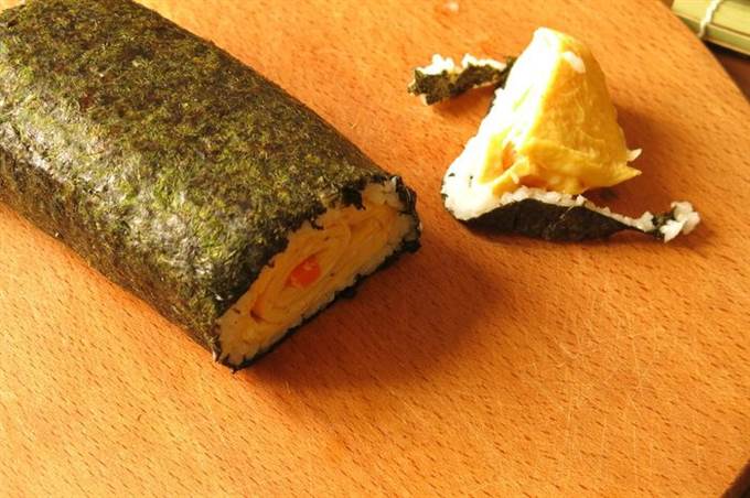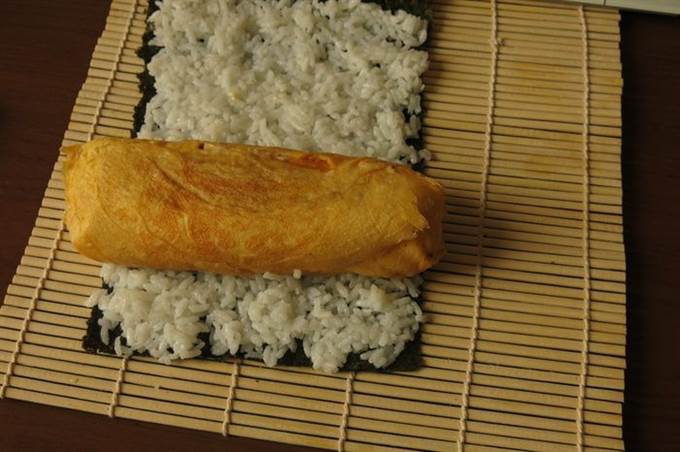 Выкладываем рис на нори так, чтобы обхватить по кругу рулет из омлета.