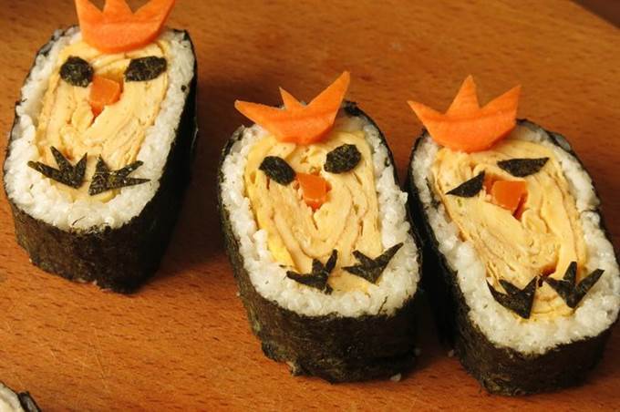 Из нори вырезаем глазки, лапки, из моркови гребень. Подаем с соусом, смесь майонеза и соевого соуса.