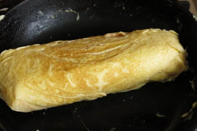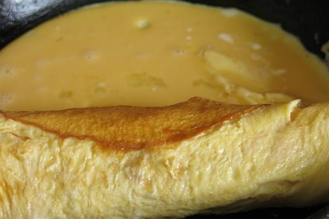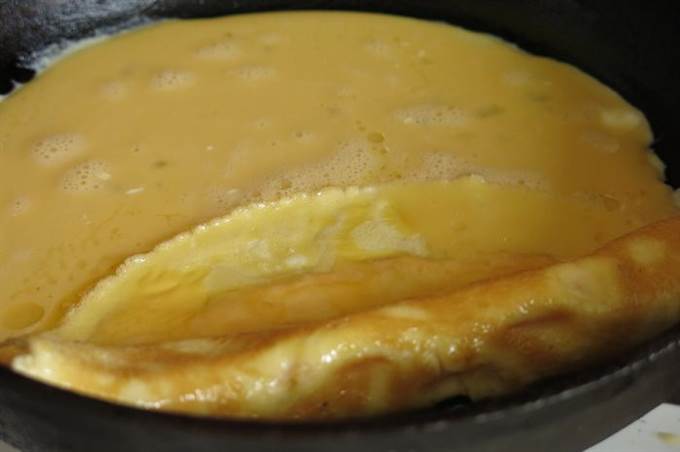 Отодвигаем омлет на край сковороды, наливаем на свободный край омлета яйца, даем схватится и снова заворачиваем. Повторяем.