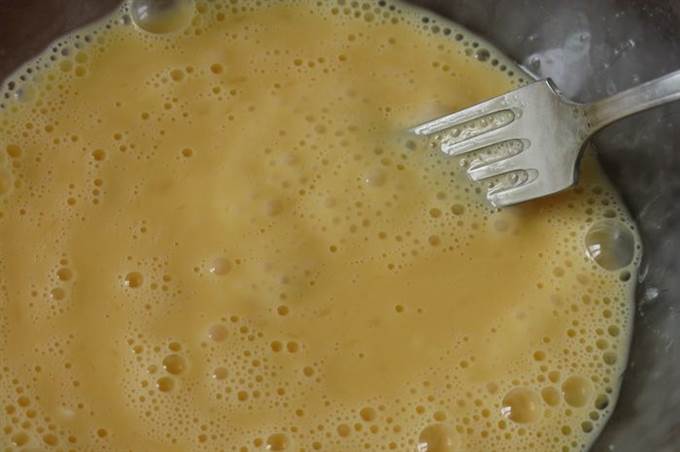 На раскаленную сковороду с растительным маслом наливаем третью часть омлетной массы.