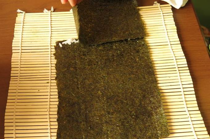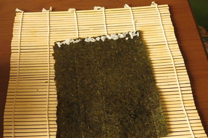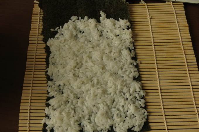 3/4 листа нори кладем на коврик (размер листа зависит от длины яичного рулета). По краю листа выкладываем тонкой полоской рис.
