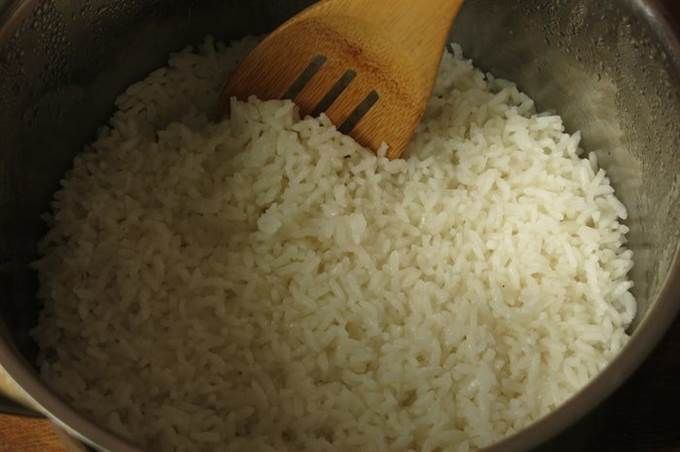 Снимаем рис с огня и выдерживаем 15 минут под крышкой. Готовим заправку, в уксусе рисовом чуть подогретом, растворяем сахар и соль, по 1 ч. л.