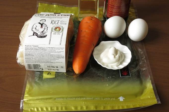 Приготовим яйца, майонез, уксус рисовый, соус соевый, сахар, морковь.