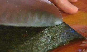 Листы нори разрезать на полоски шириной чуть больше рисовых шариков.