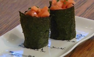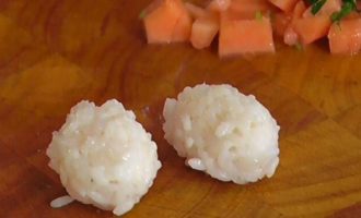 На край ворсистой стороны полоски нори выложить шарик из риса и свернуть рулетик. Поставить его «стаканчиком» и выложить сверху на рис кубики папайи.