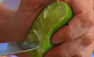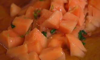 От папайи отрезать примерно 100-150 г мякоти, почистить, сбрызнуть соком лайма и посыпать мятой, а затем нарезать маленькими кубиками.