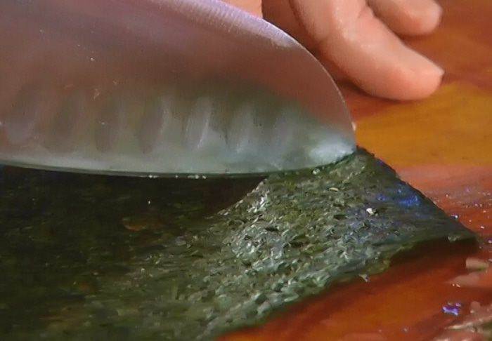 Листы нори разрезать на полоски шириной чуть больше рисовых шариков.