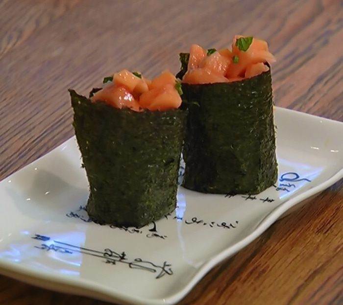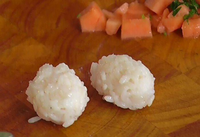 На край ворсистой стороны полоски нори выложить шарик из риса и свернуть рулетик. Поставить его «стаканчиком» и выложить сверху на рис кубики папайи.