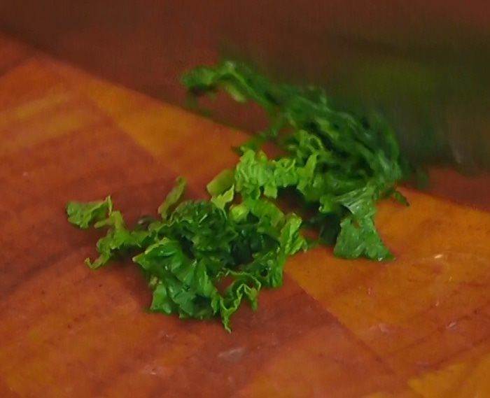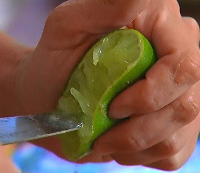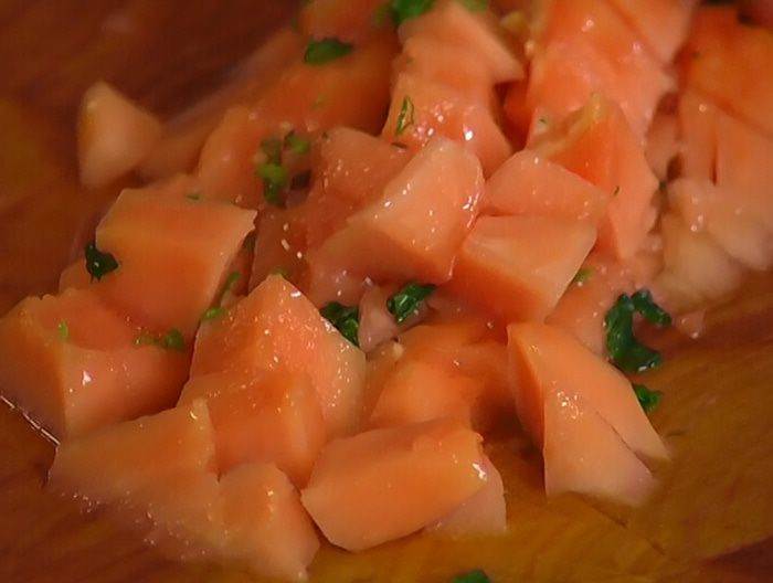 От папайи отрезать примерно 100-150 г мякоти, почистить, сбрызнуть соком лайма и посыпать мятой, а затем нарезать маленькими кубиками.