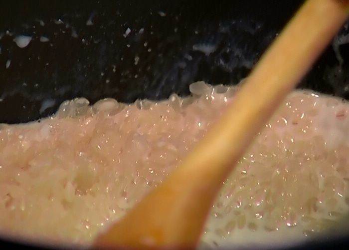 Рис всыпать в кастрюлю, влить молоко и кокосовое молоко, залить 1/2 л кипятка и отварить до готовности.