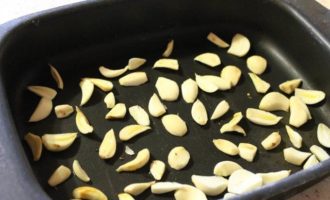 У меня было три маленьких головки чеснока, можно и больше. Очистить зубчики чеснока и выложить их в форму. Сверху положить кусочки мяса и залить все вином.