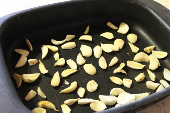 У меня было три маленьких головки чеснока, можно и больше. Очистить зубчики чеснока и выложить их в форму. Сверху положить кусочки мяса и залить все вином.
