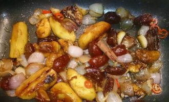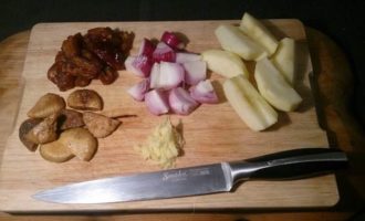 Нарезаем дольками яблоки и лук, произвольно нарезаем вяленый инжир и финики, имбирь натираем на терке.