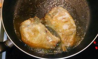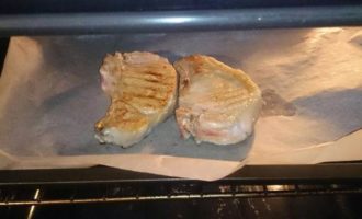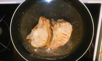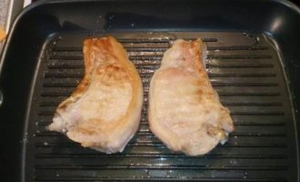 Обжариваем свиную корейку до красивых полосок 5-10 мин.
