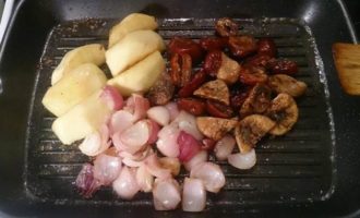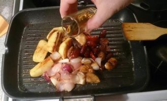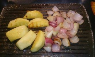 Обжариваем с добавлением коричневого сахара до красивых полосок яблоки и лук.