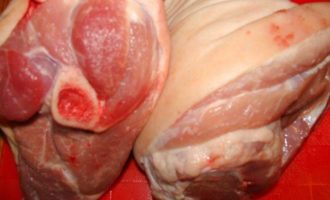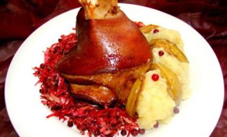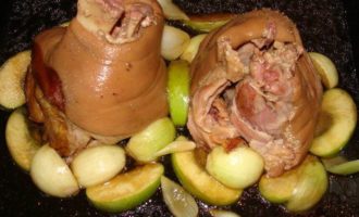 Выложить на противень, залить светлым пивом. Рядом разместить лук и яблоки из маринада. Запекать 30 минут при 180°С.