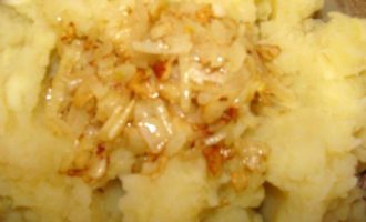Гарнир 2: Картофель отварить, сделать пюре. 1/2 зеленого яблока очистить от кожуры, потереть на мелкой терке, смешать с пюре. Лук и чеснок обжарить, можно вместе с беконом, но я посчитала это лишним, и добавить в пюре. Перемешать.