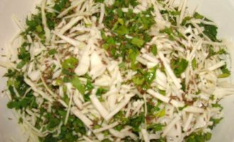 Гарнир 1: капусту тонко порезать, смешать с петрушкой и тмином, посолить, добавить сок лимона или уксус. Дать настояться.