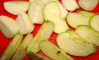 Яблоко и лук для маринада порезать дольками, поместить к рулькам.