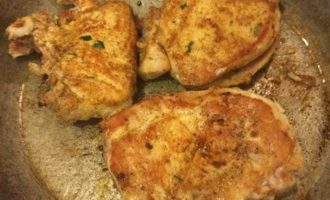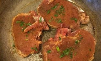 Духовку нагреть до 180°С. Сковороду разогреть, добавить 2 ст. л. масла и обжарить мясо на сильном огне с двух сторон. (по 3 — 4 минут с каждой стороны). Затем эту же сковороду закрыть фольгой и отправить мясо в духовку, жарить до готовности.