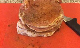 Натереть солью, перцем, вустерширским соусом и сухой аджикой. Оставить на 10 минут.