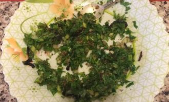 Начинка: кинзу, базилик мелко порубить, добавить зеленый лук, чеснок, горчицу, майоран и 1 ст. л. оливкого масла, перемешать.