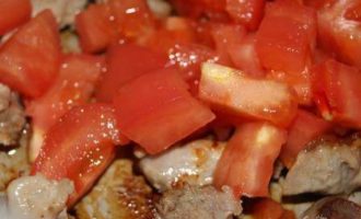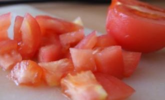 На помидоре сделать крестовой надрез, обдать кипчтком, снять кожицу. Порезать кусочками.