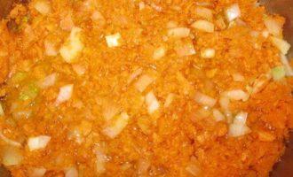 В сковороду положить морковь, лук и чеснок, жарить 3-5 минут. -