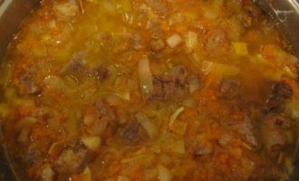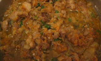Бросить мясо в сковороду и жарить, пока объём вина не уменьшится вдвое. Залить 300-400 мл куриного бульона и рубленые свежие травы. Посолить, поперчить. Сделать огонь на минимум и тушить под крышкой 1,5 часа, периодически помешивая. Затем снять крышку и готовить ещё около 20-30 минут. При необходимости можно добавлять ещё бульон. -