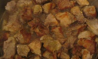 Мясо порезать на кусочки. Разогреть оливковое масло в большой тяжёлой сковороде и обжарить кусочки мяса 5-10 минут со всех сторон, пока они не подрумянятся.