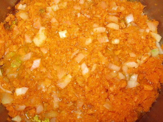 В сковороду положить морковь, лук и чеснок, жарить 3-5 минут. -