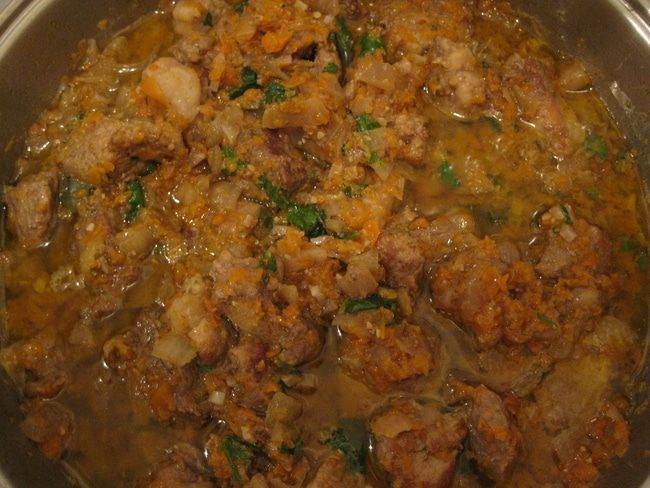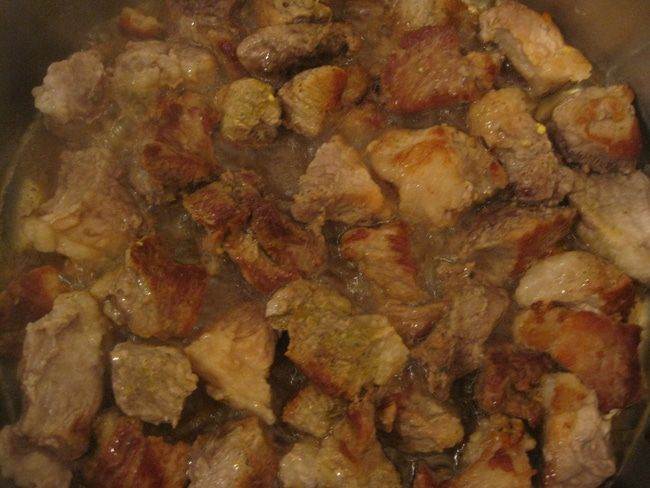 Мясо порезать на кусочки. Разогреть оливковое масло в большой тяжёлой сковороде и обжарить кусочки мяса 5-10 минут со всех сторон, пока они не подрумянятся.